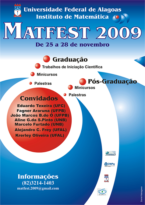 MATFEST 2009 - O Matfest é um evento promovido pelo Instituto de Matemática da Universidade Federal de Alagoas desde 2004. Neste evento são realizados minicursos, palestras, mesas-redondas e exposições de trabalhos das categorias, PIBIC, TCC, Extensão e Pesquisa (Graduação e Pós-Graduação). Durante este encontro, o Instituto de Matemática recebe pesquisadores de outras instituições, os quais realizam palestras e avaliações de trabalhos de diversas categorias.