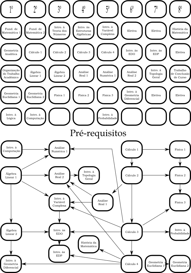 Na grade curricular dos cursos de Matemática Bacharelado e Matemática Licenciatura podemos observar as disciplinas que serão abordadas por cada modalidade, assim como os pré-requisitos e a progressão do curso.